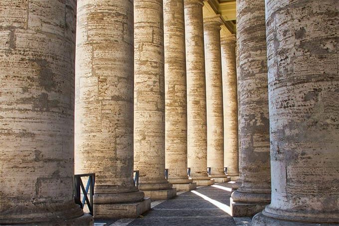 - Die optische Täuschung der Kolonnaden: Es gibt zwei runde weiße Marmorplatten auf der Piazza San Pietro: Sie sind die Brennpunkte der Ellipse (Centro del Colonnato). Wenn man sich genau darauf stellt, erscheinen die vier Säulenreihen wie eine einzige.